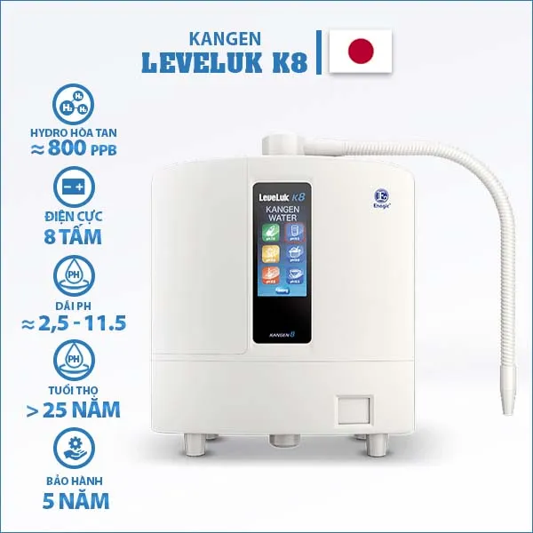 Máy lọc nước ion kiềm Kangen Leveluk K8 là thiết bị chăm sóc sức khỏe cao cấp, phổ biến tại hơn 150 quốc gia, bao gồm cả Việt Nam. Với công nghệ điện phân tiên tiến và khả năng tạo ra 7 loại nước ion kiềm khác nhau, sản phẩm này không chỉ đem lại nước sạch mà còn hỗ trợ nhiều lợi ích cho sức khỏe.