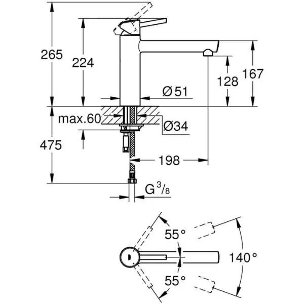 Kích thước của Vòi chậu rửa mặt GROHE Concetto – 31128001